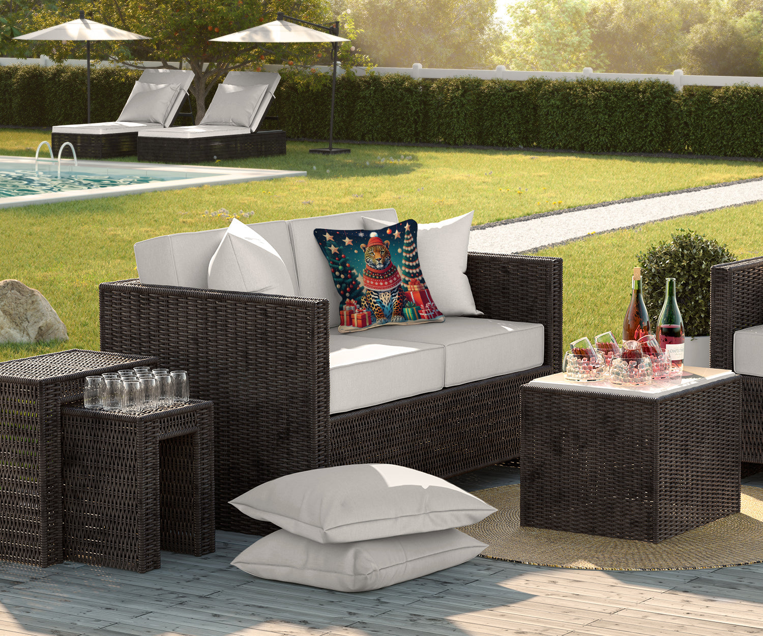 Throw Pillow featuring breed specific Leopard artwork. Celebrate Christmas with this Christmas Pillow. Revitalize your outdoor or indoor living space with Caroline's Treasures 18x18 Fabric Decorative Pillow. With a generously sized dimension of approximately 18 inches by 18 inches, this pillow makes a comfortable and aesthetic addition to any seating area. Made from a unique, water-resistant material developed by Caroline's Treasures, the pillow sham is 100% polyester fabric that's durable and ready to weather any condition. Its vibrant, full-color artwork will not fade over time as it is dyed with color-fast dyes. Whether you place it on your patio furniture, porch, veranda, or indoor couch, its soft canvas fabric ensures a cozy experience. The pillow is handcrafted in the United States, featuring a sham created from three pieces of fabric and a polyester insert for enduring shape and overstuffed comfort. Despite being robustly built to endure the outdoors, it is as soft and snug as your favorite indoor cushions. Please note, as all our pillows are handmade, sizes may vary slightly, adding to the charm of this unique decorative item.
